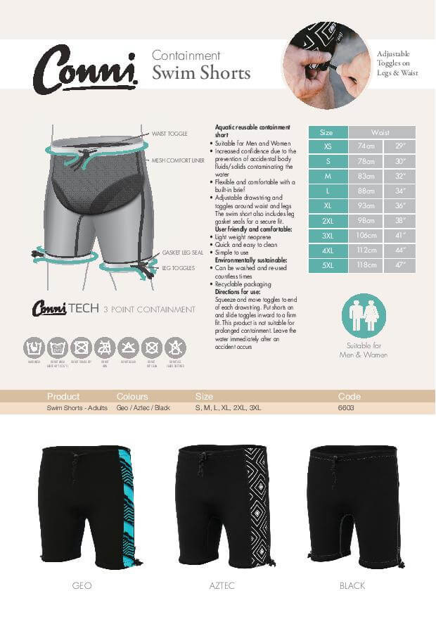 Conni reusable swim shorts are designed to contain bladder and bowel matter.