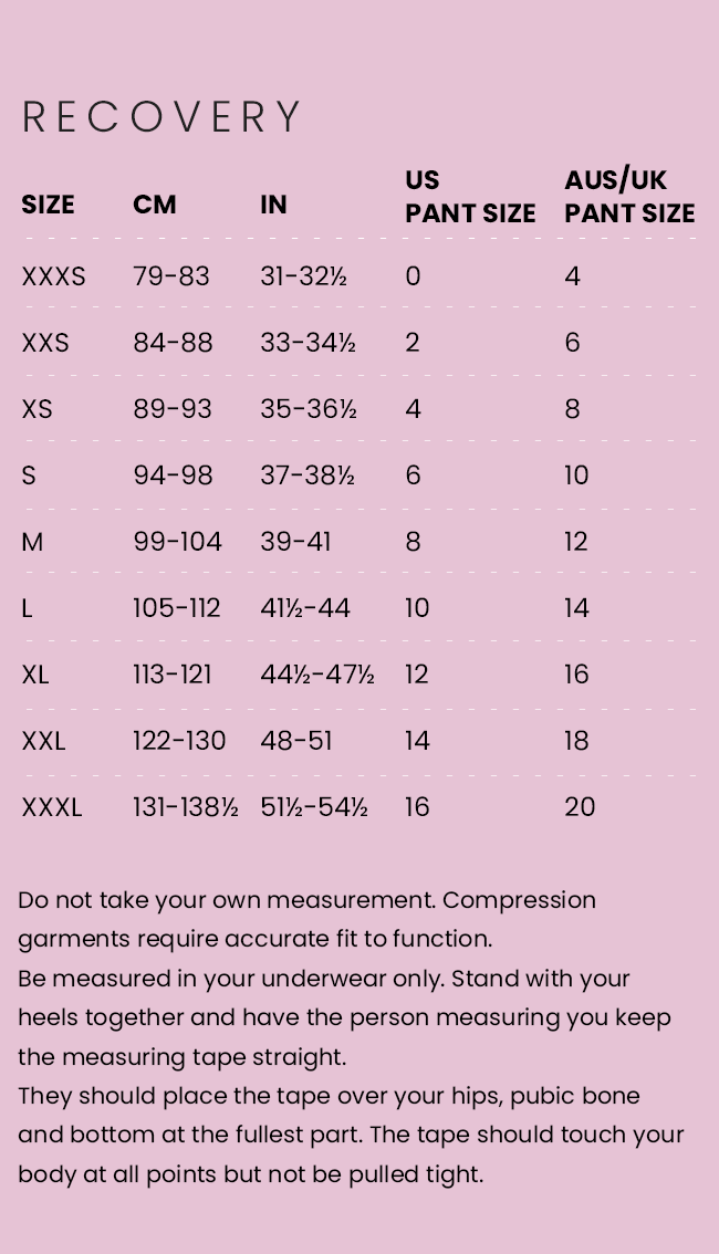 Correct measurement for our garments is crucial. As they are medical garments they may not always correlate to general/fashion clothing sizes. General fashion sizes also vary drastically by country and by brand (we find that an Australian XS can equate to a S or even M in American sizes) so we strongly recommend you have someone else take your measurements and use this guide to size yourself up.