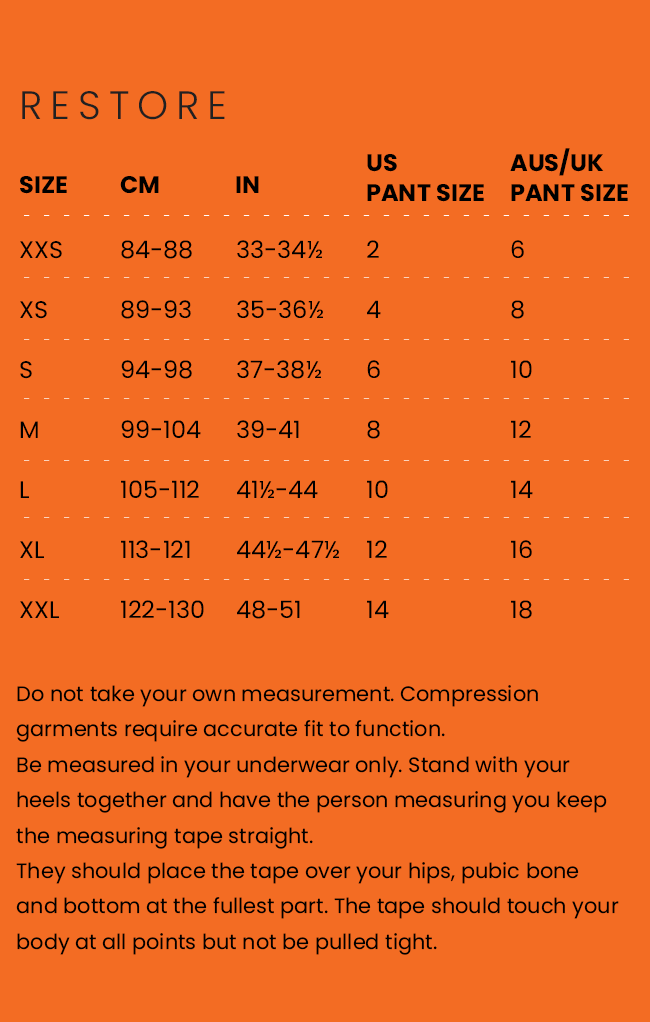 Correct measurement for our garments is crucial. As they are medical garments they may not always correlate to general/fashion clothing sizes. General fashion sizes also vary drastically by country and by brand (we find that an Australian XS can equate to a S or even M in American sizes) so we strongly recommend you have someone else take your measurements and use this guide to size yourself up.